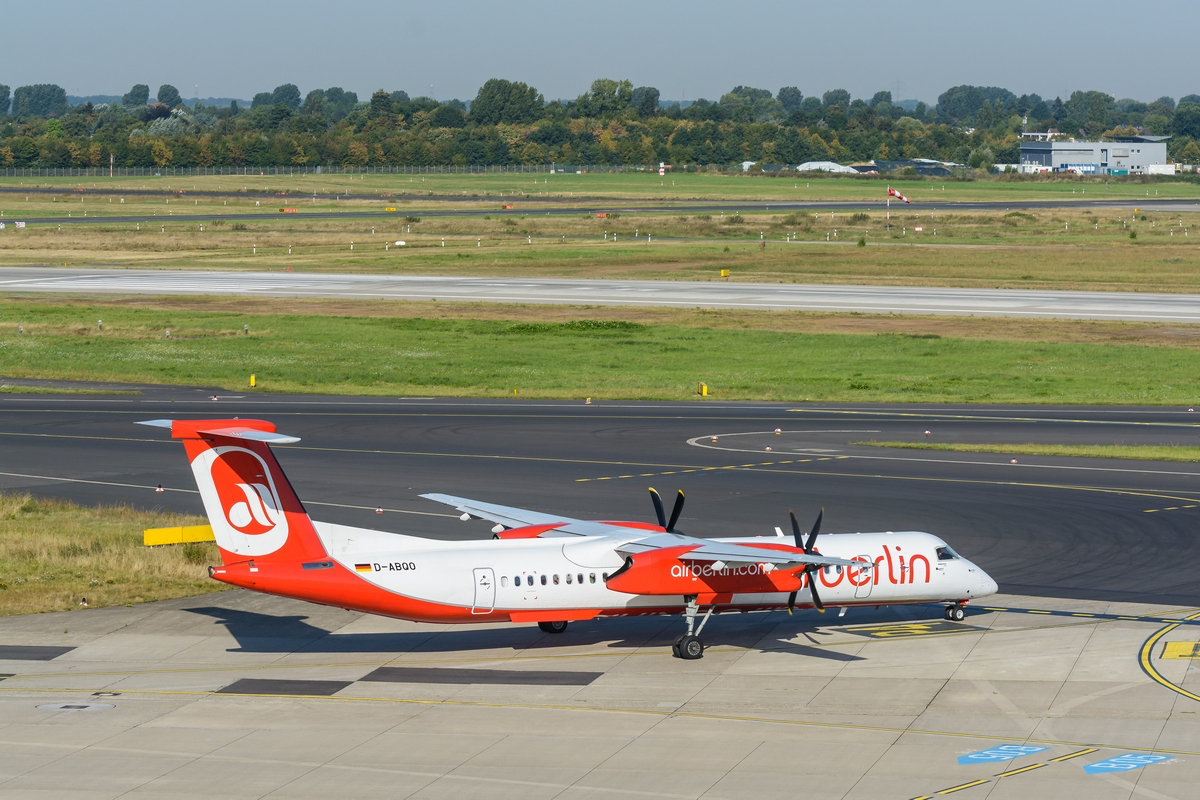 Air Berlin opby LGW Bombardier DHC-8-402Q Dash 8 D-ABQO am 28.08.2016 in Düsseldorf.