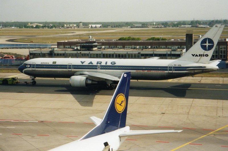 Hier ist eine Boeing 767-300 der Fluggesellschaft Varig aus Brasilien zu sehen, die gerade zur Startbahn gebracht wird (gescanntes Bild)