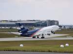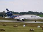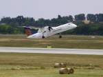 Wettrennen zwischen der startenden D-AEWE (British Aerospace BAe-146-200) von Eurowings und einem Jeep. (Leipzig am 13.7.2009)