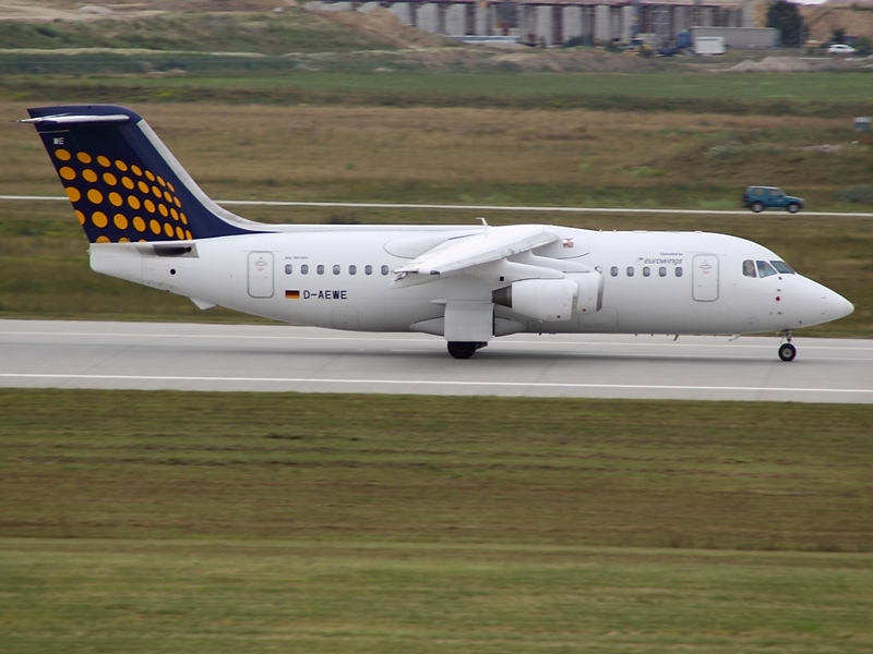 Wettrennen zwischen der startenden D-AEWE (British Aerospace BAe-146-200) von Eurowings und einem Jeep.