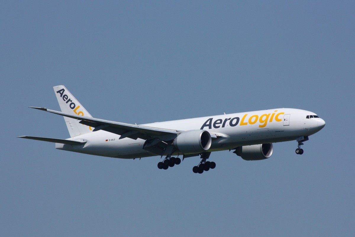 AeroLogic Boeing 777F (D-AALD) bei der Landung auf dem Flughafen Leipzig/Halle. Fotografiert am 08.06.2014.