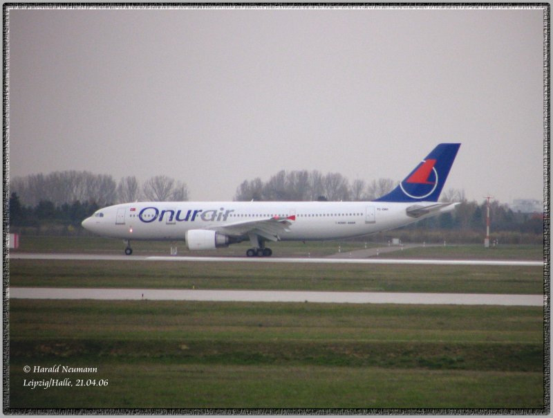 Ein A300-600 der türkischen Onurair ist am Abend gerade auf dem Flughafen Leipzig/Halle gelandet u. rollt nun zum Terminal. 21.04.06