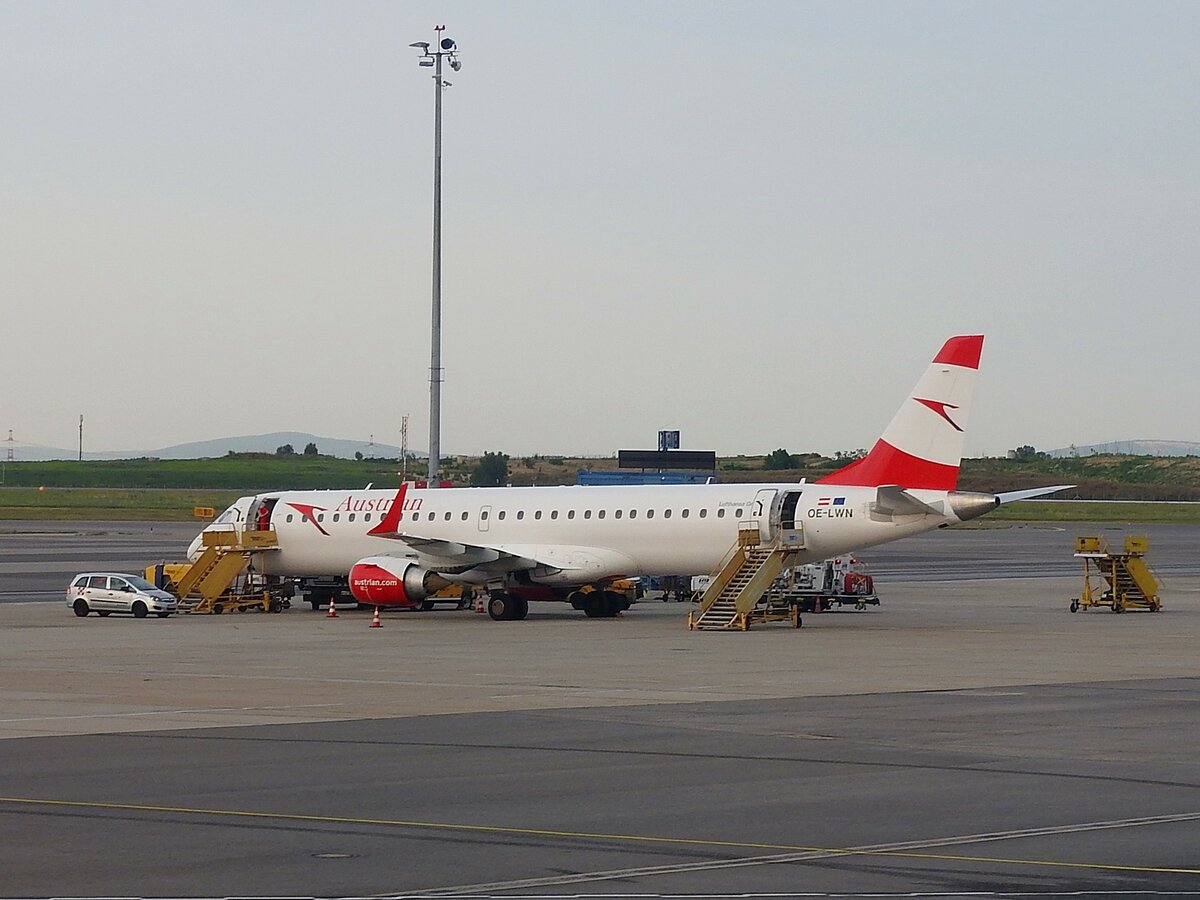 Embraer ERJ-195LR (ERJ-190-200 LR), Kennung: OE-LWN, von Austrian; konnte während eines Landeanfluges in WIEN-SCHWECHAT(VIE-LOWW) am Flugfeld beobachtet werden; 230706