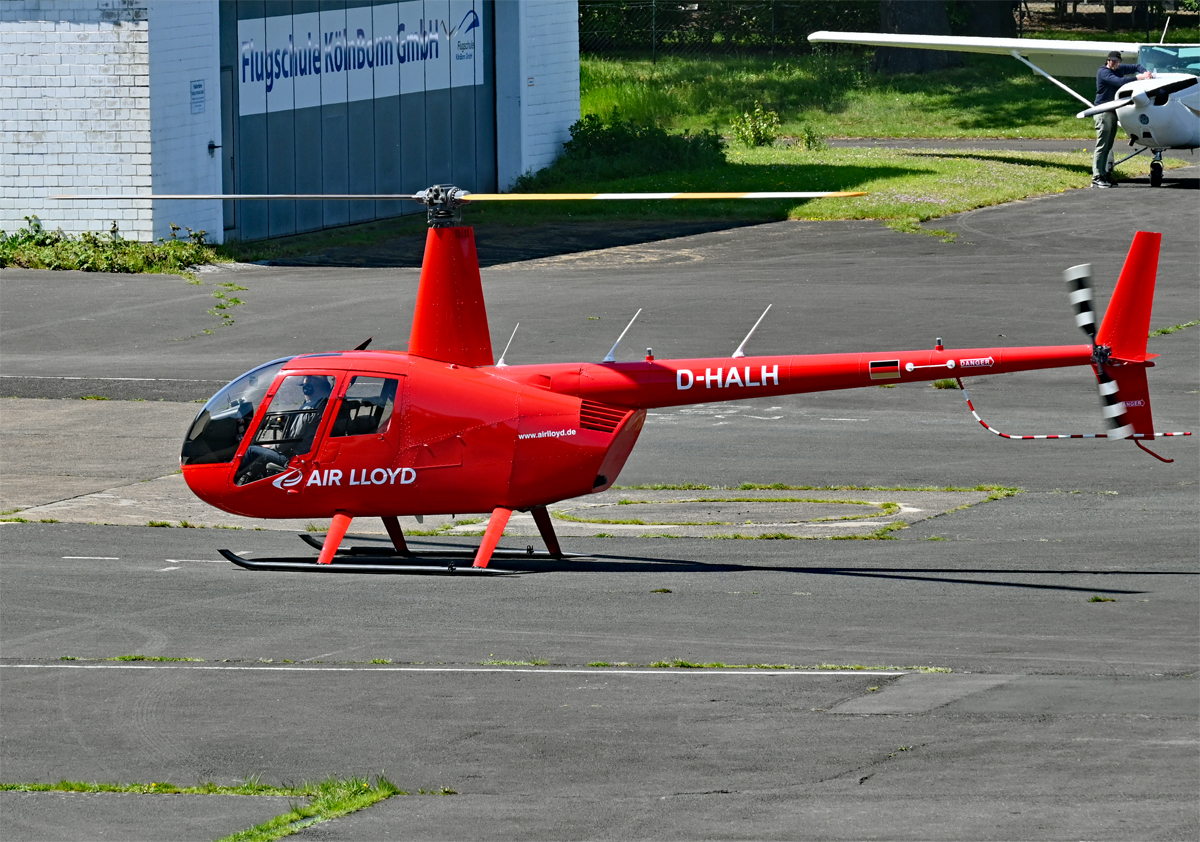 Robinson R-44 Raven II, D-HALH der Fa. Air Lloyd vor der Firmenhalle in EDKB - 03.05.2023