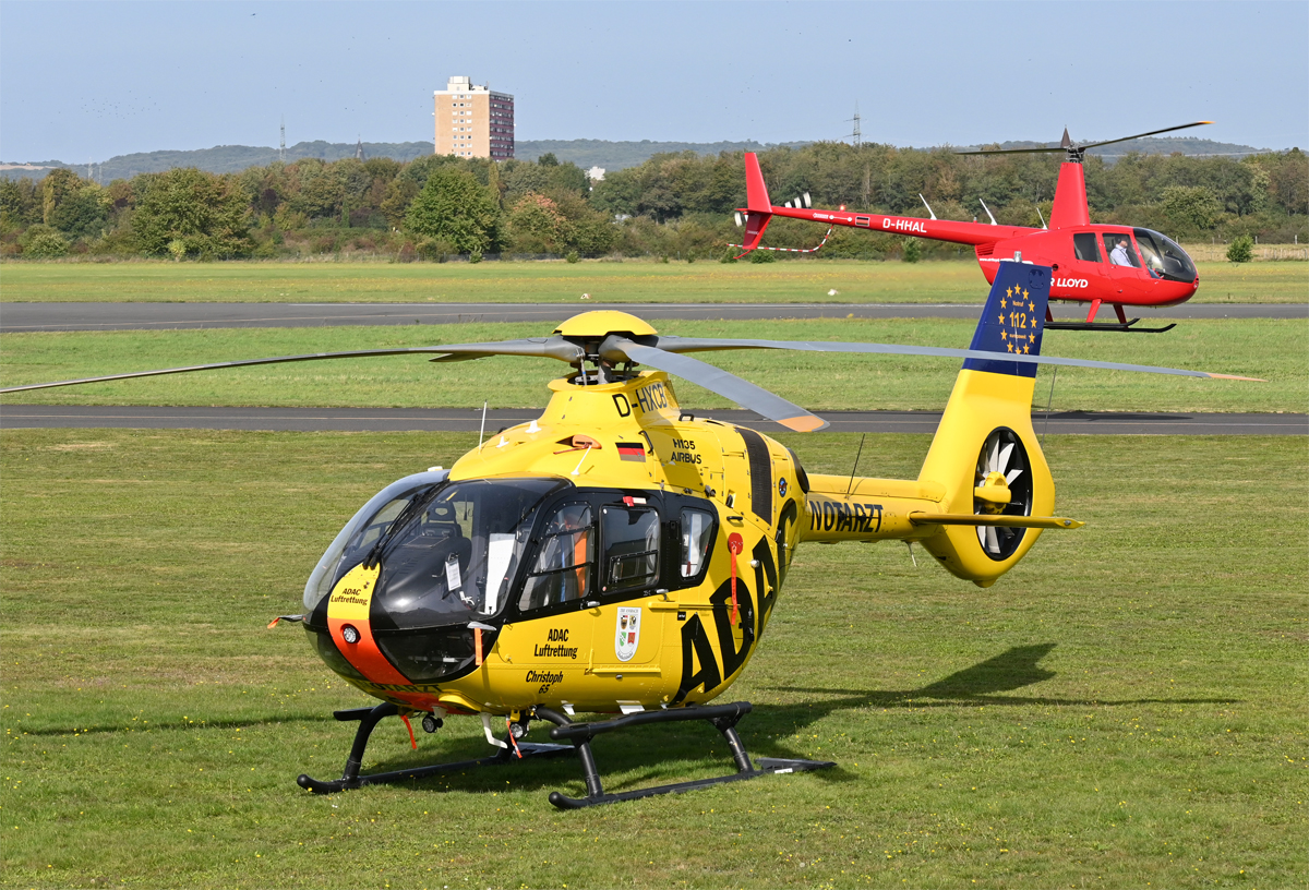 H 135, D-HXCB des ADAC und dahinter hovert der R-44 D-HHAL von Air Lloyd in EDKB - 11.10.2023