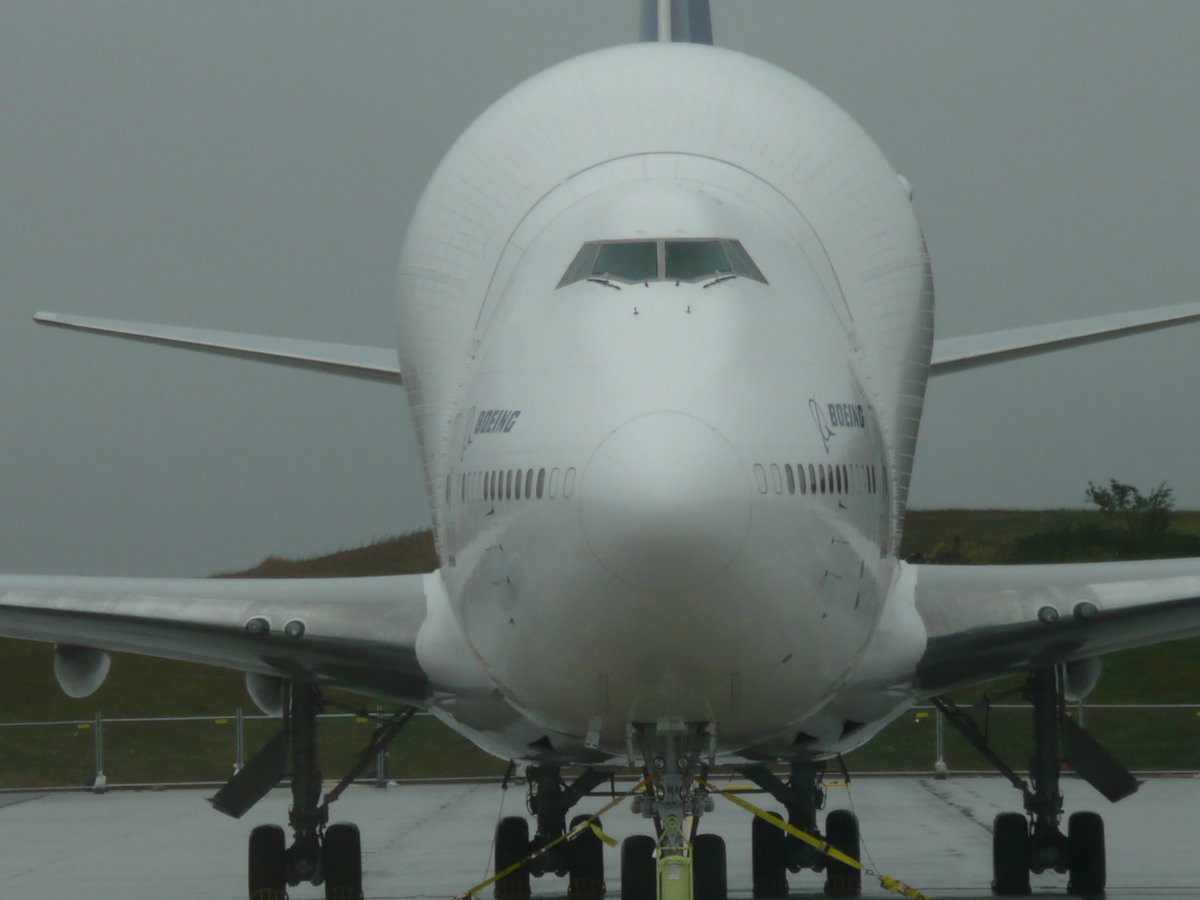 Dreamlifter von vorn, geparkt neben dem Boeing-Museum "Future of Flight" in Everett. Diese Flugzeuge wurden zum Transport von großen Teilen des Dreamlifters B787 nach Everett gebaut und waren zum Zeitpunkt der Fotoaufnahme nicht in Betrieb, da die Produktion wegen fehlender Freigabe des Flugzeugtyps durch die FAA stockte.