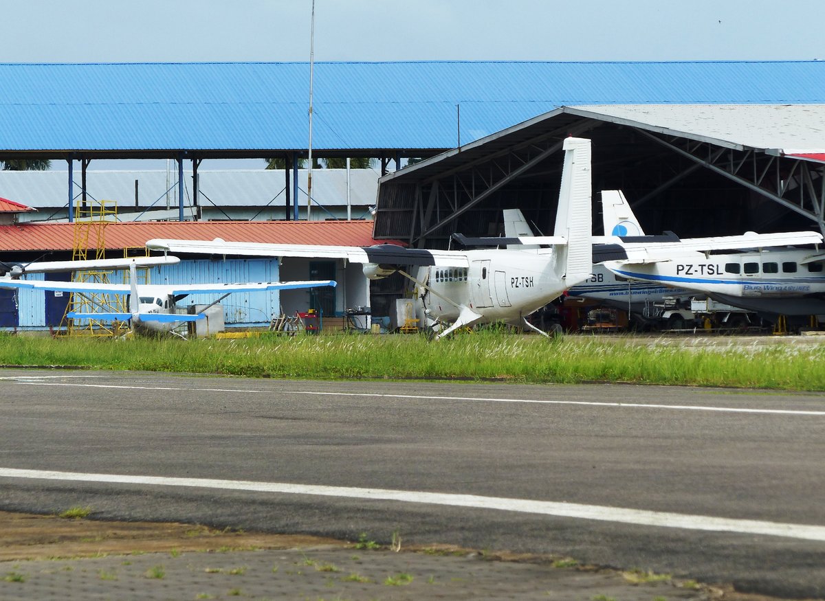 De Havilland DHC-6-300, PZ-TSH, 2 Cessna 208B Grand Caravan ,PZ-TSL und PZ-TSB, Cessna 206 Stationair, PZ-TLV, Blue Wings Airlines, Zorg en Hoop Airport Paramaribo (ORG), 2.6.2017