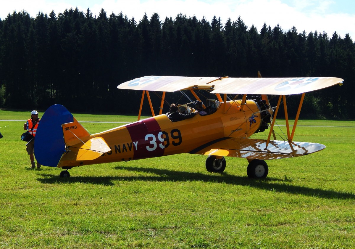 Doppeldecker BOEING PT-17 STEARMAN der US-Navy,220 PS starkes Trainingsflugzeug, vor dem Start am 29.8.2015 bei der BREITSCHEID-AIRSHOW-INTERNATIONAL bei HAIGER/Ww