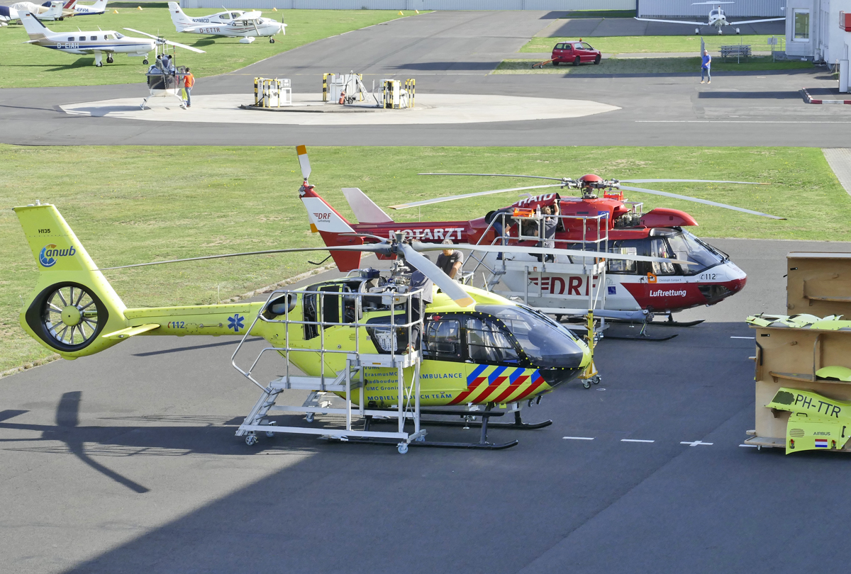 Vor der ADAC-Werft in Bonn-Hangelar, BK 117 D-HAID der DRF (Christoph Europa 5) und eingerüstet eine H-135, PH-TTR der Ambulance NL - 14.10.2019