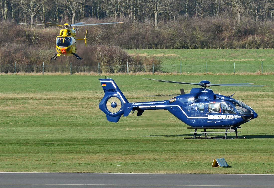 EC 135T-2, D-HVBO der Bundespolizei und dahinter eine BK 117 D-HBKK des ADAC in Bonn-Hangelar - 16.02.2016