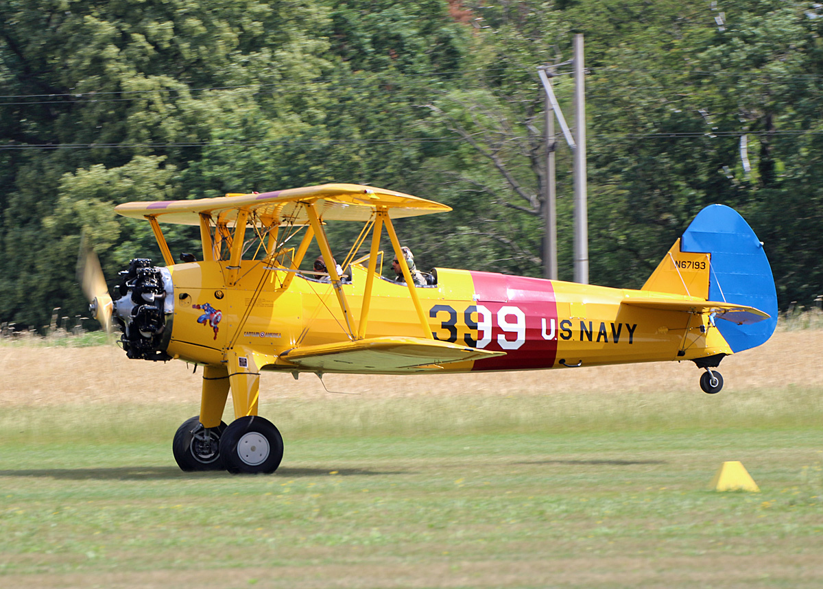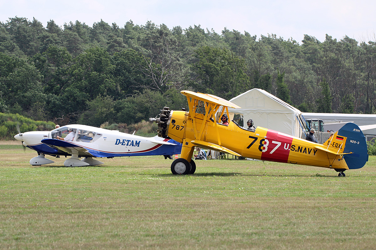 Private PT-13D Kaydet N9054H, Quax Boeing A75N1 D-EQXL, Flugplatz Bienenfarm, 16.09.2018