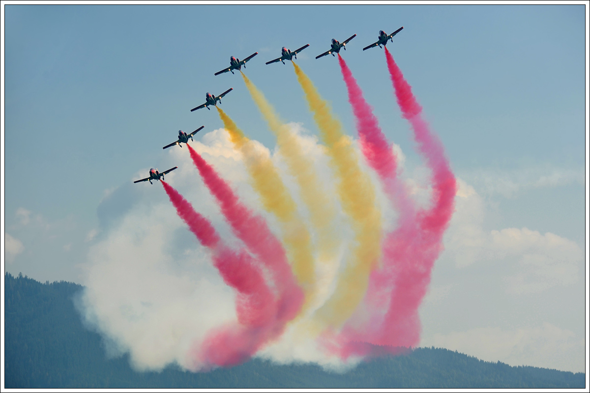 Total vernachlässigt habe ich bis jetzt PATRULLA AGUILA (dt: Adlerpatrouille) welche auf der Luftwaffenbasis San Javier nahe La Manga del Mar Menor stationiert ist. Geflogen wird mit leicht modifizierten Modellen CASA C-101 Aviojet. Der Abschluss ihrer Show bildet immer ein Überflug in den spanischen Nationalfarben. Die Patrulla Aguila ist weltweit die einzige Kunstflugstaffel, die ein simultanes Landemanöver zeigt. Airpower16 in Zeltweg am 9.2.2016.