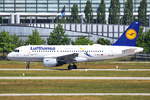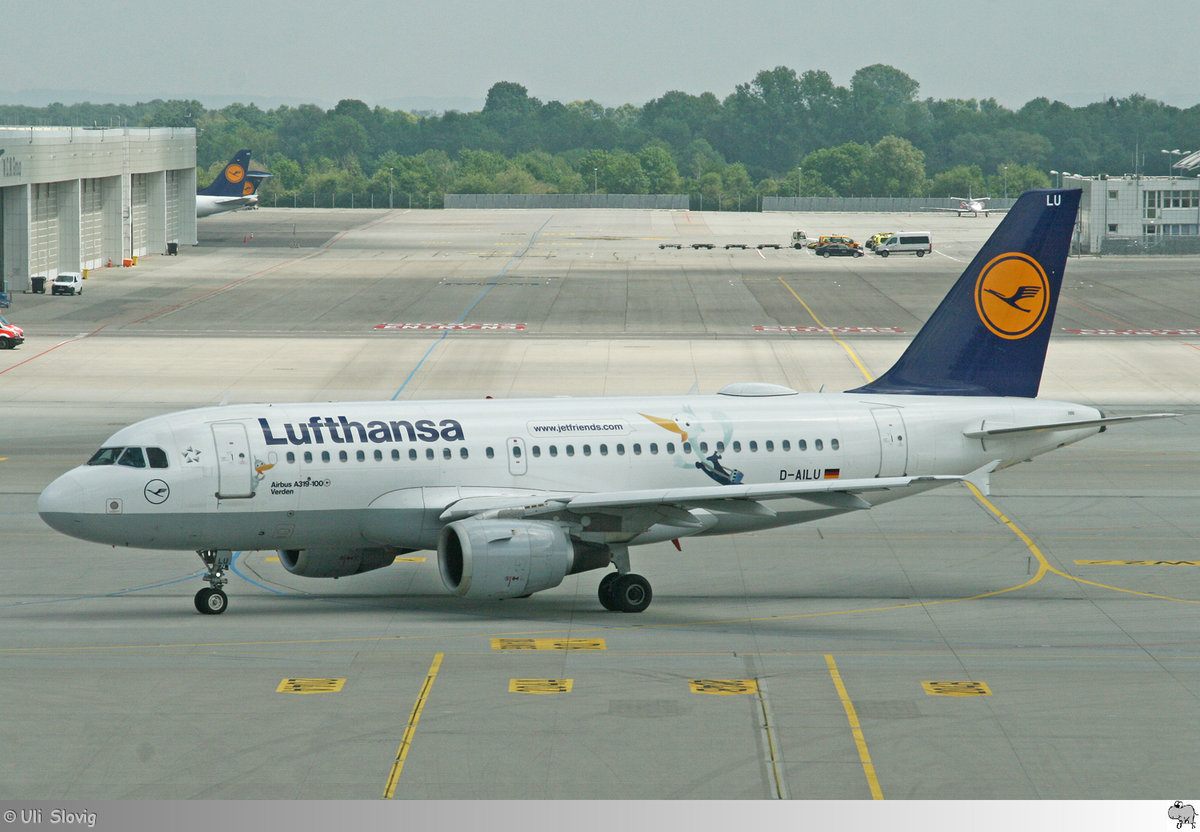 Am 11. Mai 2018 rollt der Lufthansa Airbus A319-100 D-AILU  Verden , mit Sonderbeklebung von Lu und Cosmo, auf dem Münchener Flughafen zur Startbahn.