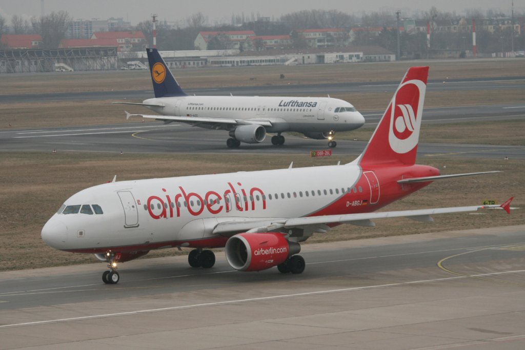 Air Berlin A 319-112 D-ABGJ am 27.01.2012 auf dem Flughafen Berlin-Tegel. Im Hintergrund Lufthansa A 320-214, D-AIZD.