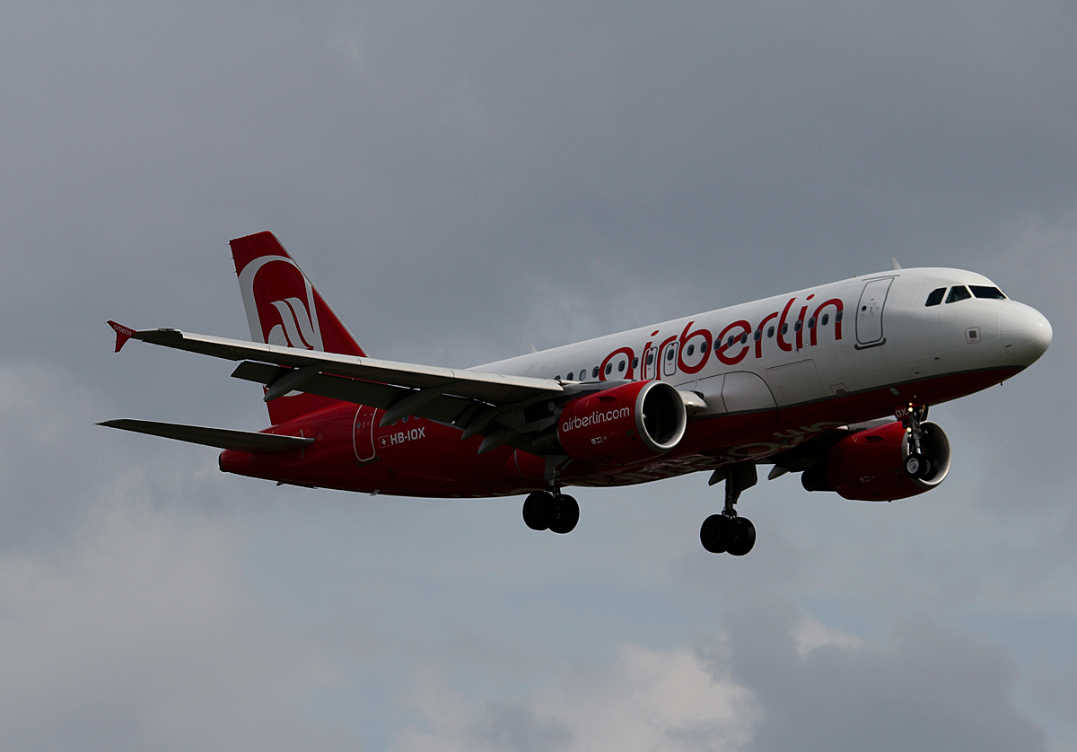 Air Berlin(Belair) A 319-112 HB-IOX bei der Landung in Berlin-Tegel am 09.05.2014