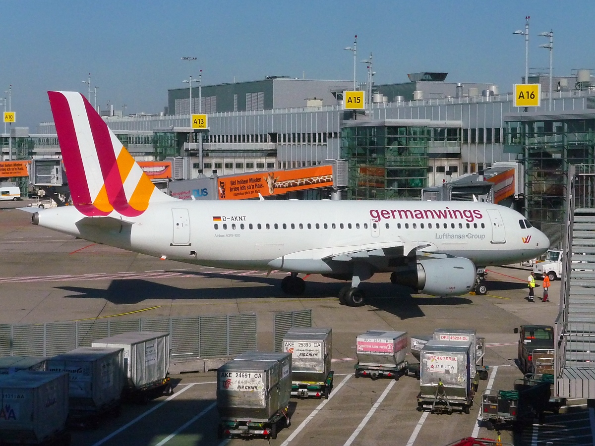 Germanwings Airbus A319 D-AKNT am Flughafen Düsseldorf, 1.10.2015, aufgenommen vom Verbindungsgang Terminal A/B