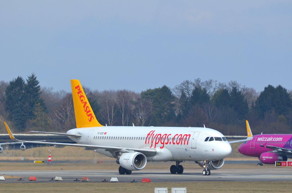 Pegasus Airlines Airbus A320 TC-DCD Deniz (Deniz ist ein türkischer Name Übersetzt bedeutet er Das Meer) beim rollen zum Gate am Airport Hamburg Helmut Schmidt am 11.03.18