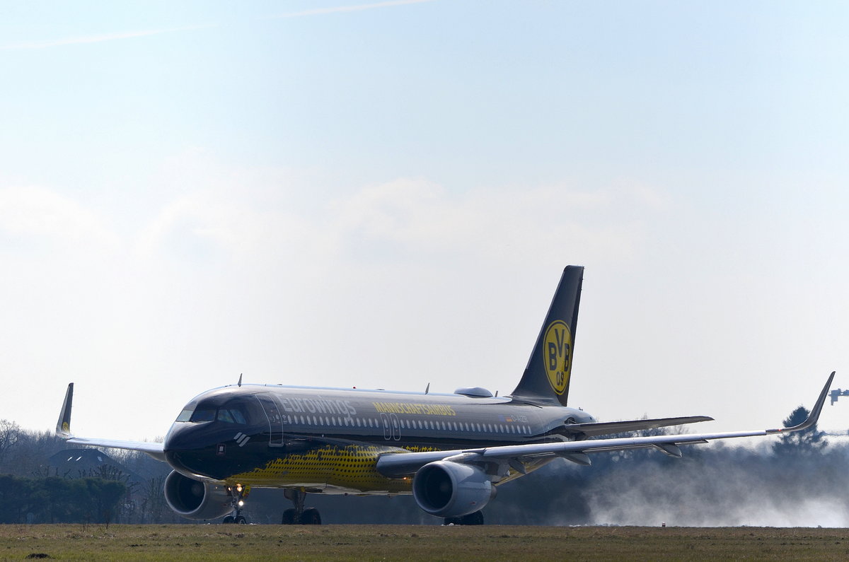 Eurowings Airbus A320 D-AIZR BVB Borussia Dortmund Livery beim Start am 30.03.18 am Airport Hamburg Helmut Schmidt aufgenommen.