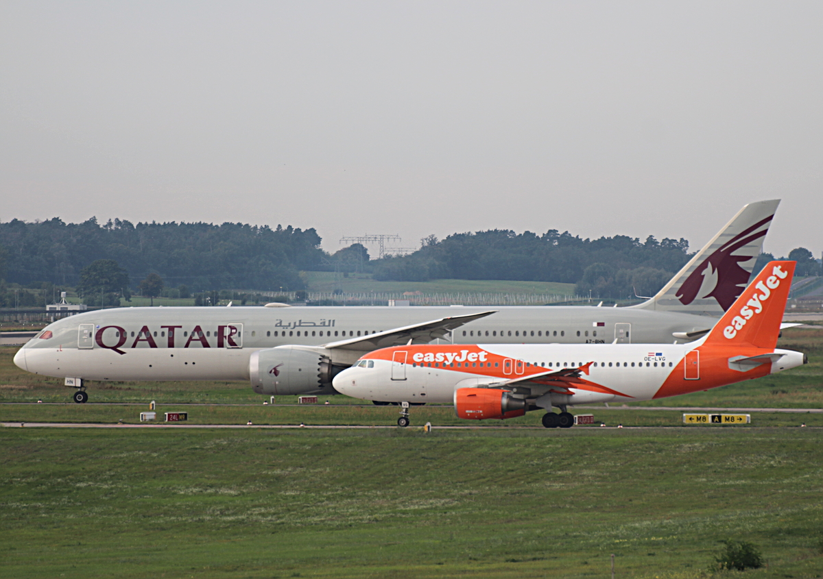 Qatar Airways, Boeing 787-9 Dreamliner, A7-BHN, Easyjet Europe, Airbus A 319-111, OE-LVG, BER, 21.09.2025