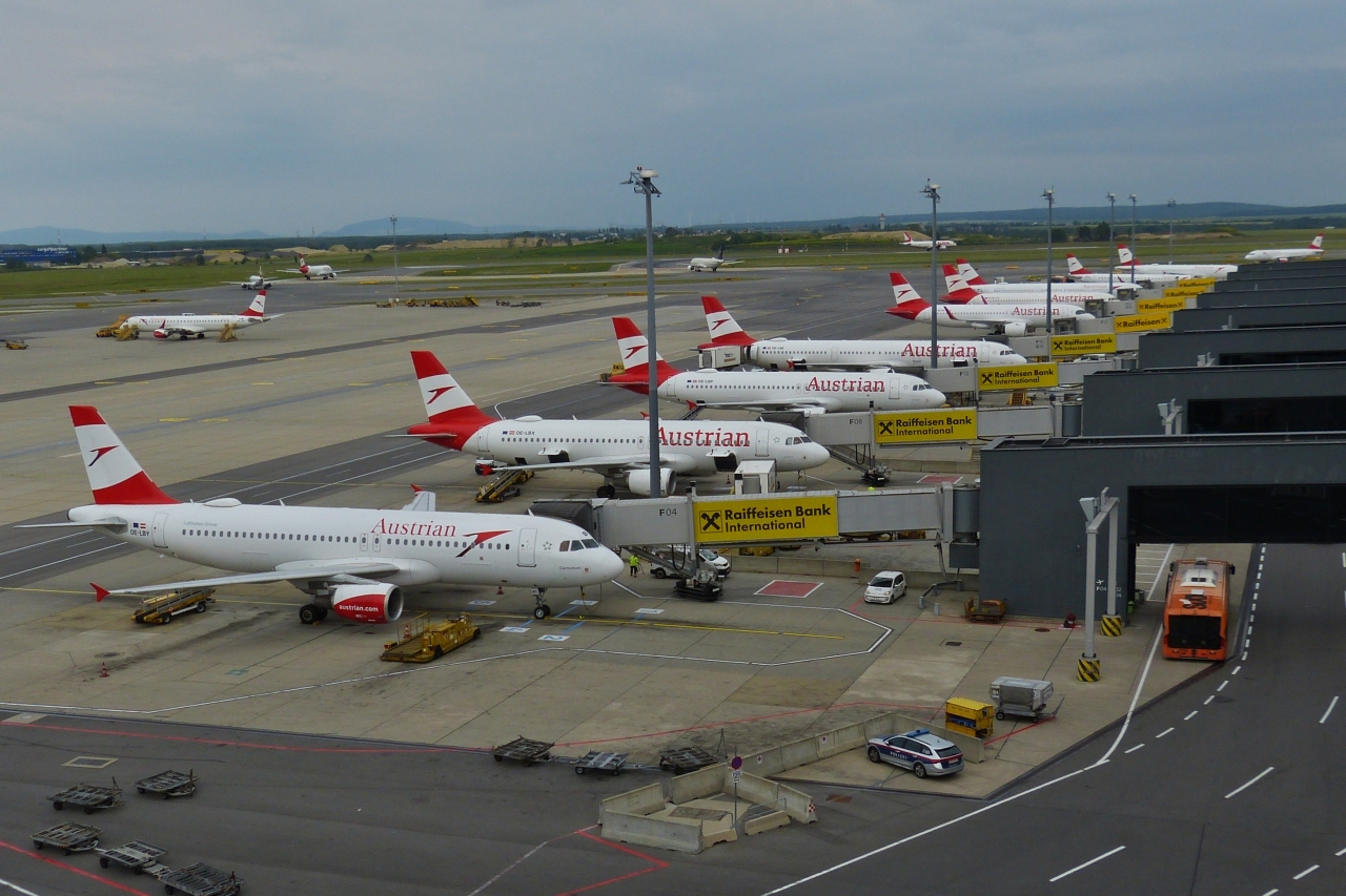 Blick von der Besucherterrasse des Flughafens Wien auf die Angedockten Flugzeuge der Austian Airlines um die Passagiere aufzunemmen oder aussteigen zu lassen. Im Vordergrund die OE-LBY Airbus A 320 – 214 der Austrian Airlines. 06.2023