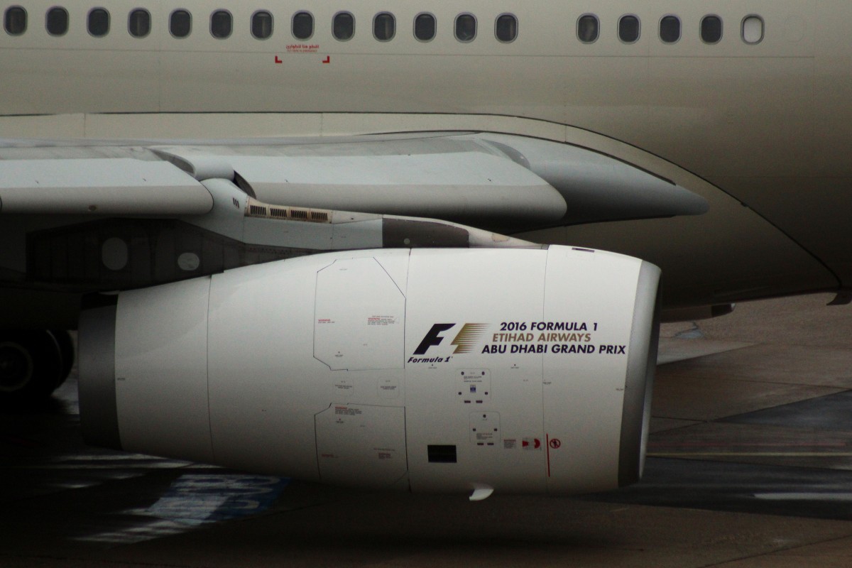 A6-EYH Engines Rr Trent 772B-60, 20.02.2016, DUS-EDDL, Düsseldorf, Germany (Sticker:Formula 1 Abu Dhabi 2016)