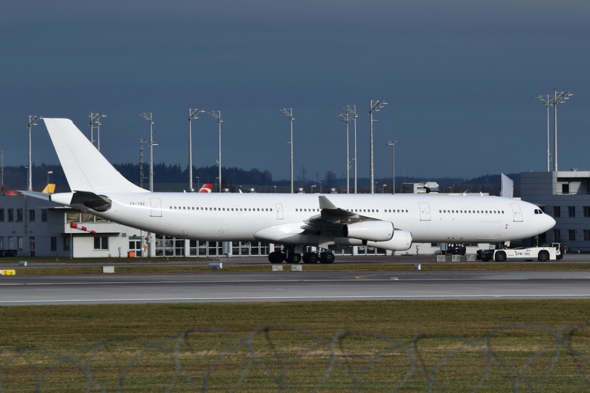 CS-TQZ Hi Fly Airbus A340-313 zum Gate in München am 12.12.2015