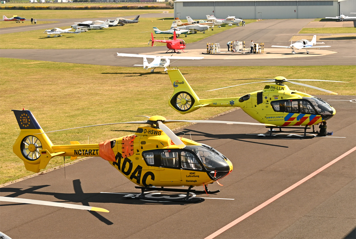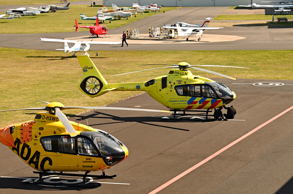 EC 135 P3 PH-LLN AMBULANCE-Niederland vor der ADAC-Werfthalle in EDKB - 03.04.2025 Davor die EC 135 P2 des ADAC D-HSWG.