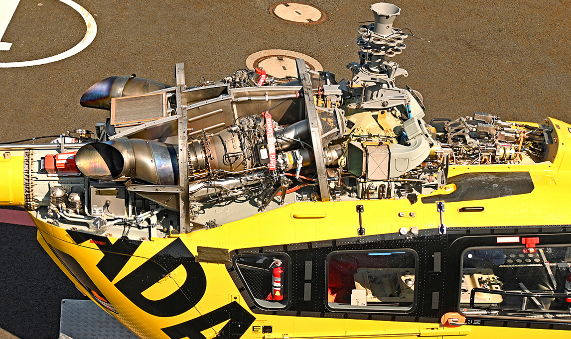 Offenes Getriebedeck mit Turbinen und Rotormast von einer EC 135 P2 des ADAC bei der Inspektion in Bonn-Hangelar - 03.04.2025