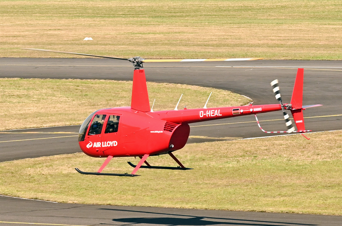 R 44 Raven I D-HEAL hovert von der Tankstelle zur Air Lloyd-Halle in EDKB - 03.04.2025