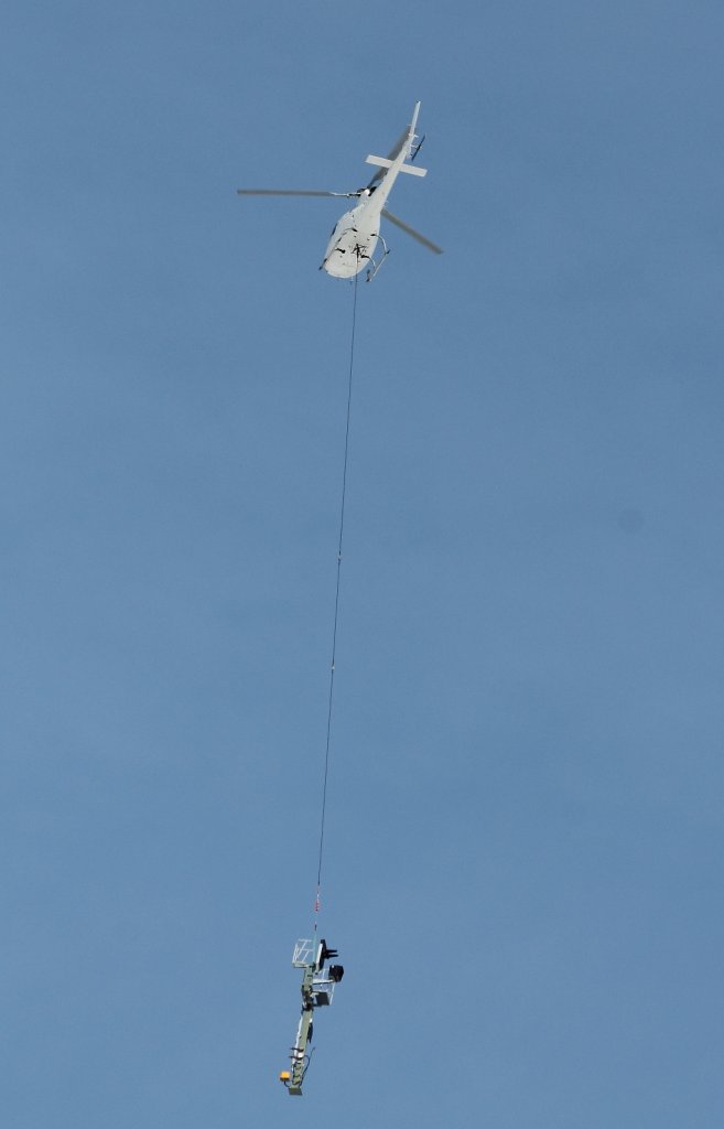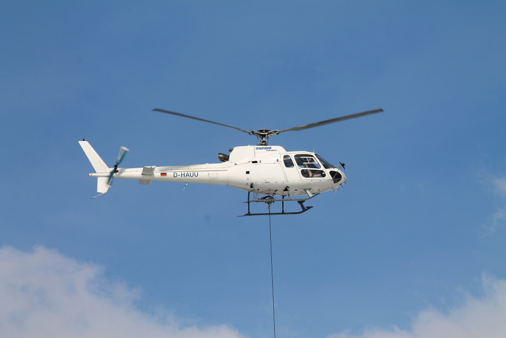 Eurocopter AS 350 B 1 der Meravo Luftreederei D-HAUU beim Kranflug für Eisenbahnbaustelle der STRABAG AG in Nassenheide 26.03.2013.