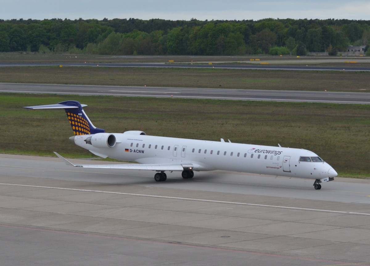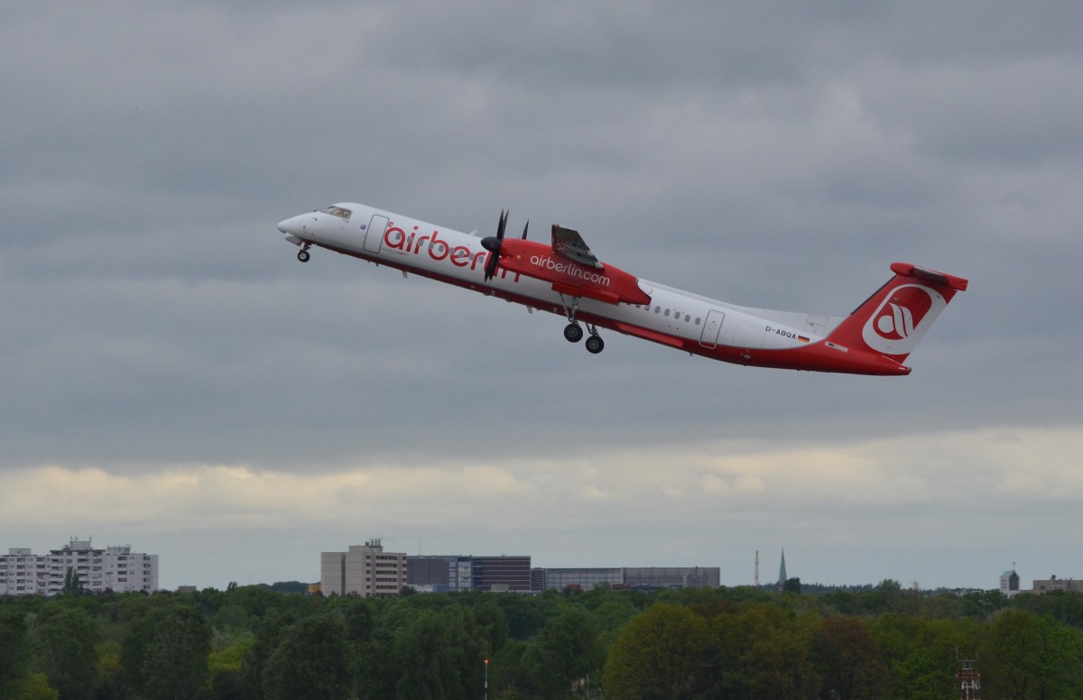 Die Q400 ist ein zweimotoriges Turboprop-Flugzeug des kanadischen Herstellers Bombardier. Startet gerade in Berlin-Tegel am 10.05.15. Im Hintergrund die Regierungsmaschine der Bundesrepublik Airbus A340-313X VIP 16+01 „Konrad Adenauer“ M. Schiebel