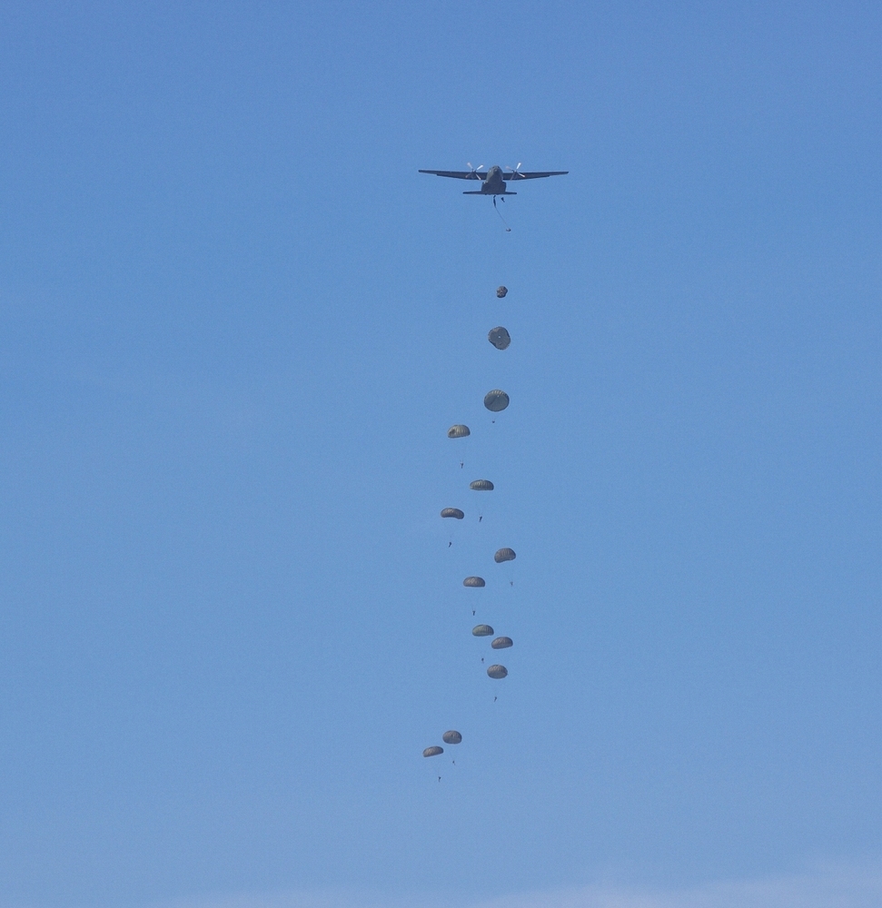 Zuverlässiges Arbeitstier - 1968 kamen die ersten Serienflugzeuge vom Typ Transall C-160 zur Bundeswehr. Noch bis 2018/2019 sollen die betagten Maschinen im Einsatz bleiben. Hier beim Absetzen von Fallschirmjägern am 15.07.2014 über dem Flugplatz Wallerfangen-Düren, danach überfliegt die Transall unser Grundstück in Felsberg. Erhard Pitzius