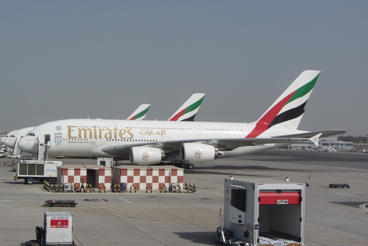 Emirates Airbus A 380-800 (A6-EEC) am Flughafen in Dubai am 15. August 2013 bei der Bereitstellung für einen neuen Flug. Nebenan warten weitere A380. Emirates ist im Besitz von 50 A 380 und hat 90 weitere bestellt. Somit ist die Emirates die Fluglinie, die weltweit am meisten A 380 besitzt.