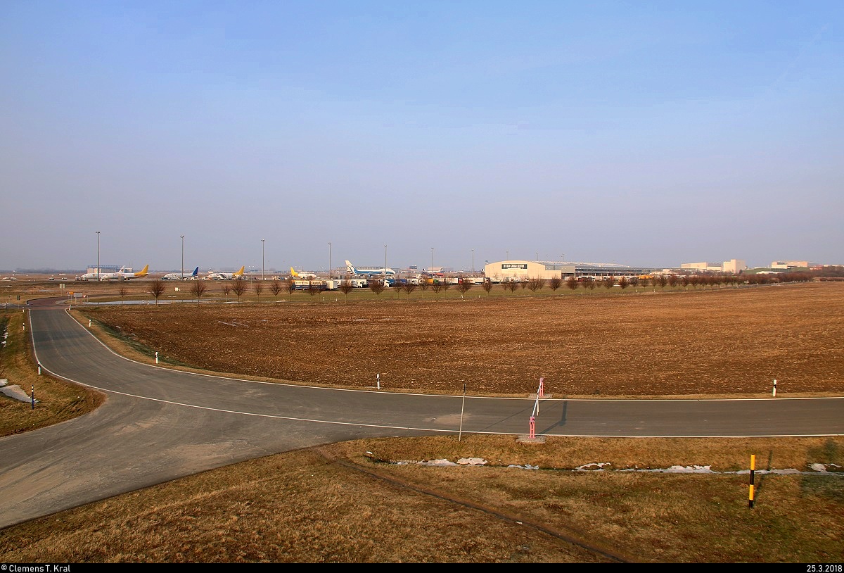 Blick auf das südliche Gelände des Flughafens Leipzig/Halle mit zahlreichen Frachtflugzeugen und dem World Cargo Center. Aufgenommen vom Bahnhaltepunkt Schkeuditz West in der Abendsonne. [25.3.2018 | 18:12 Uhr] Clemens Kral