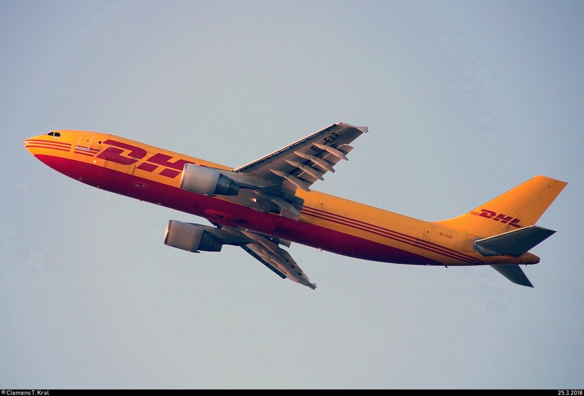 Ein Airbus A300-600 (EI-EXR | A300B4-622R(F)) von ASL Airlines Ireland startet im Flughafen Leipzig/Halle auf der Bahn 08R/26L. Aufgenommen vom Bahnhaltepunkt Schkeuditz West. [25.3.2018 | 18:20 Uhr] Clemens Kral
