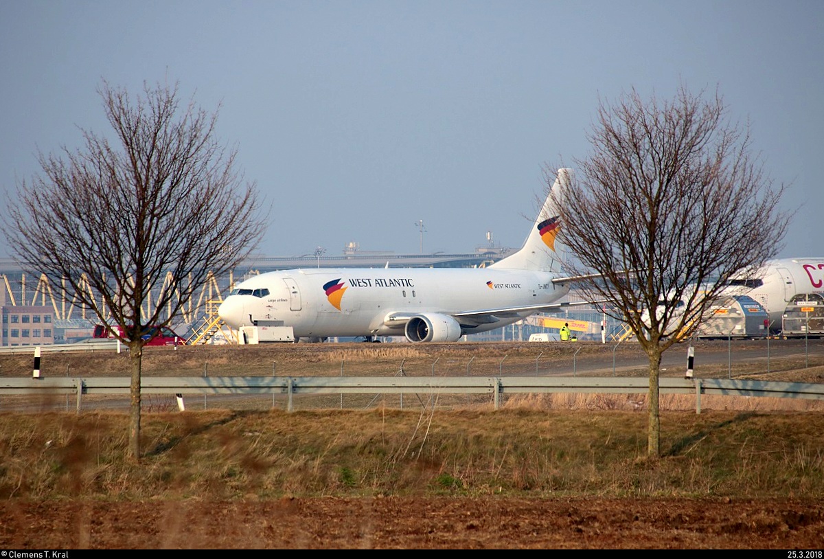 Eine Boeing 737-400F (G-JMCY | 737-4Q8(SF)) von West Atlantic steht im Flughafen Leipzig/Halle. Aufgenommen vom Bahnhaltepunkt Schkeuditz West, daher leider etwas verdeckt. [25.3.2018 | 17:47 Uhr] Clemens Kral