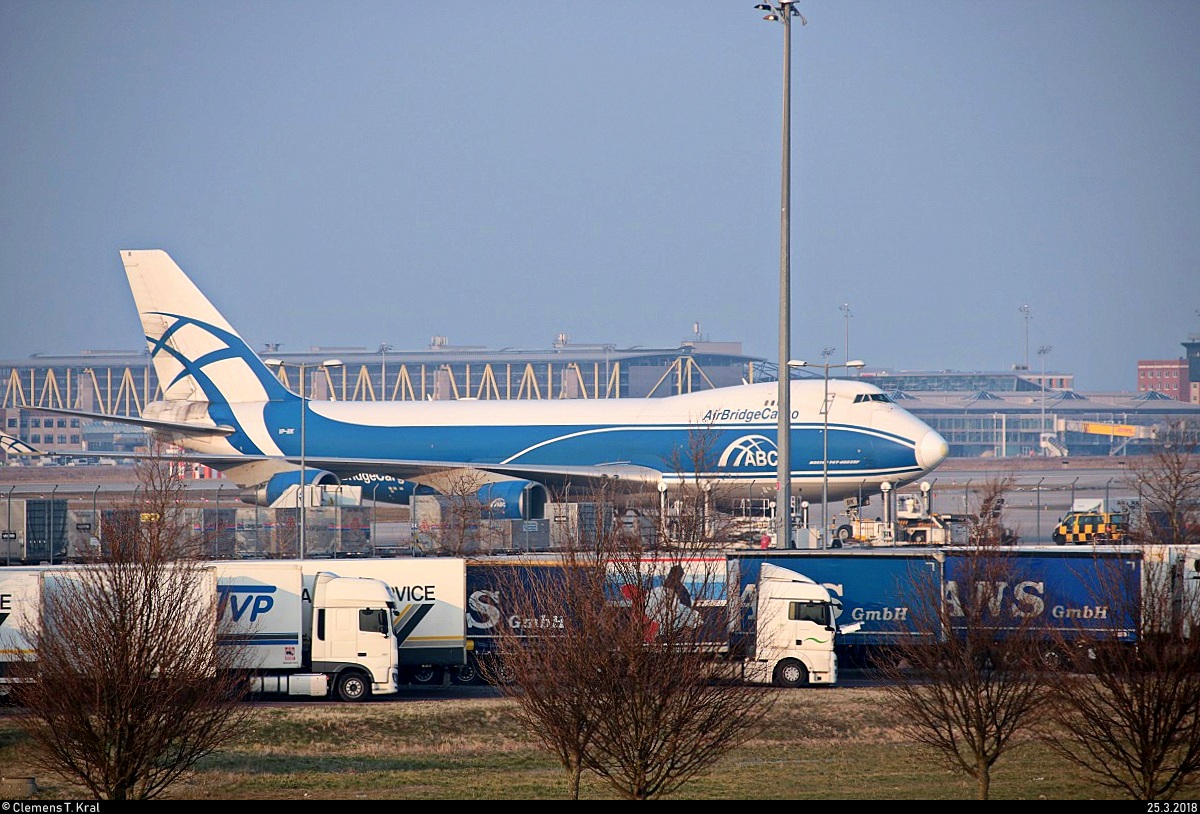 Eine Boeing 747-400 ERF von AirBridgeCargo steht im Flughafen Leipzig/Halle. Aufgenommen vom Bahnhaltepunkt Schkeuditz West, daher leider etwas verdeckt. [25.3.2018 | 18:11 Uhr] Clemens Kral
