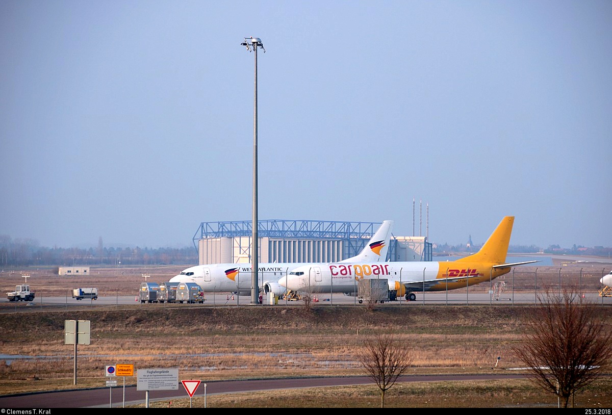 Zwei Boeing 737-4Y0(SF), im Vordergrund LZ-CGT von Cargo Air, dahinter eine Maschine von West Atlantic, stehen im Flughafen Leipzig/Halle. Aufgenommen vom Bahnhaltepunkt Schkeuditz West, daher leider etwas verdeckt. [25.3.2018 | 18:10 Uhr] Clemens Kral