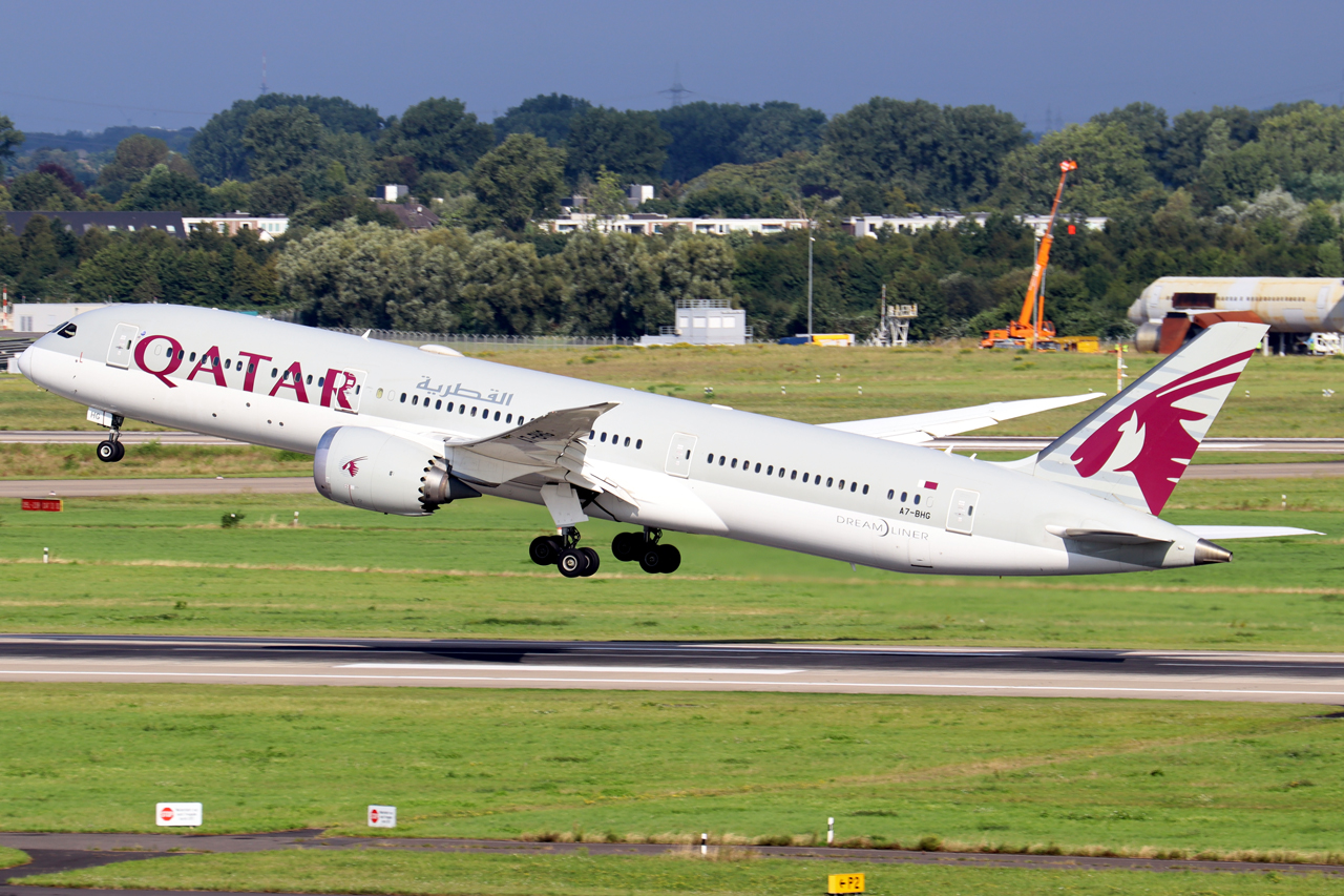 Qatar Airways Boeing 787-9 Dreamliner A7-BHG beim Start in Düsseldorf 24.8.2024