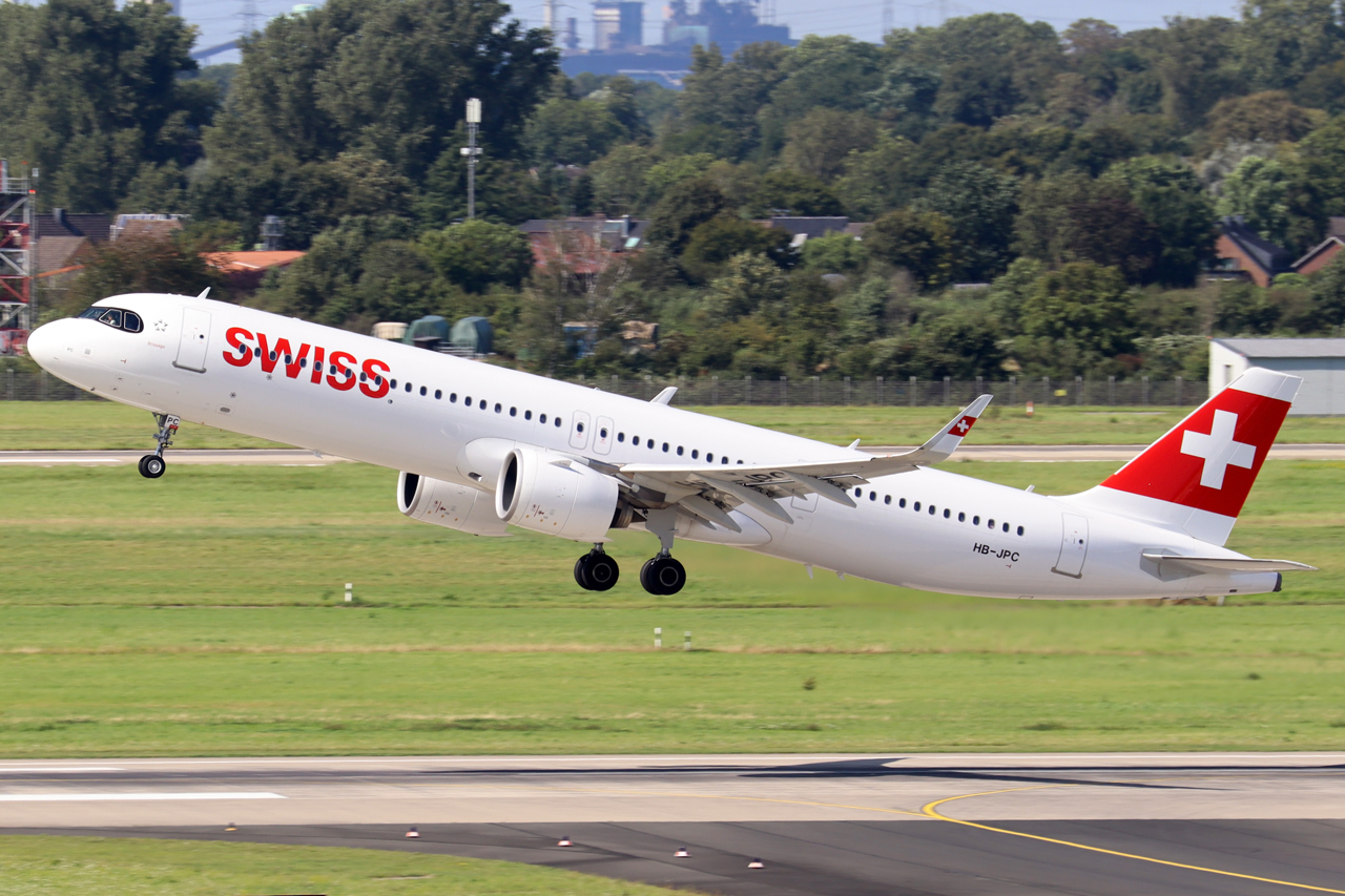 Swiss Airbus A321-271NX HB-JPC beim Start in Düsseldorf 24.8.2024