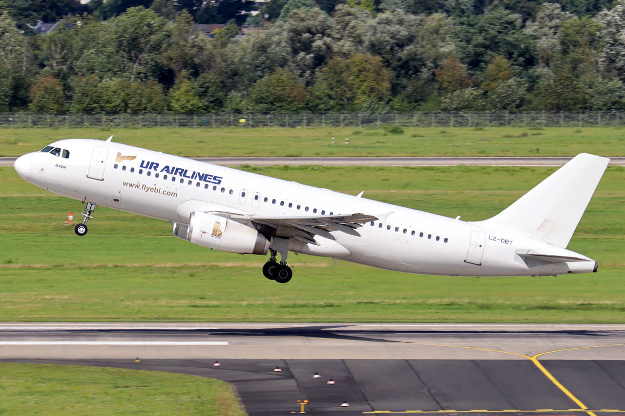 UR Airlines Airbus A320-232 LZ-DBT betrieben von BH Air beim Start in Düsseldorf 24.8.2024