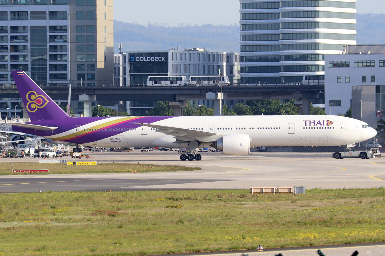 Thai Airways Boeing 777-3ALER HS-TKM wird zur Parkposition geschleppt in Frankfurt 30.4.2024