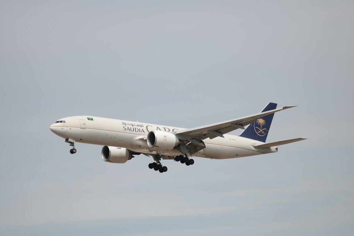 Saudi Arabian Cargo Boeing 777 HZ-AK71 am 08.05.21 in Frankfurt am Main Flughafen beim Landeanflug von einen Fotopunkt aus fotografiert