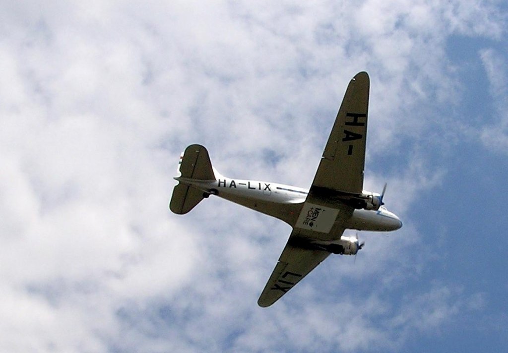 HA-LIX über Budapest, das einzige noch lebende LI2 Flugzeug (DC-2 gebaut -mit vielen Veränderungen- in der Sowjetunion, nach amerikanischer Licenc). Der "HA-LIX" wurde in Taskent gebaut im Jahre 1949. Sein restauration begann im Jahre 1997, erster Flug danach: im Jahre 2001.