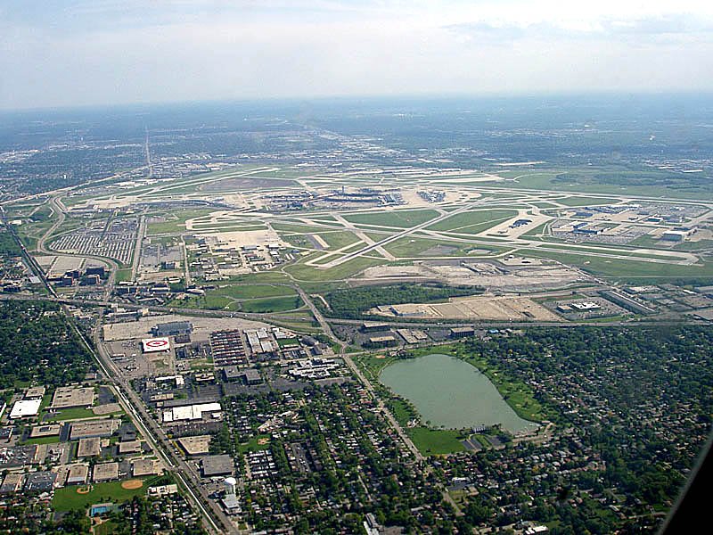 Kurz nach dem Start in Chicago O'Hare. Dessen Flugpisten und Gebäude sind einigermassen gut sichtbar, 24. Mai 2003