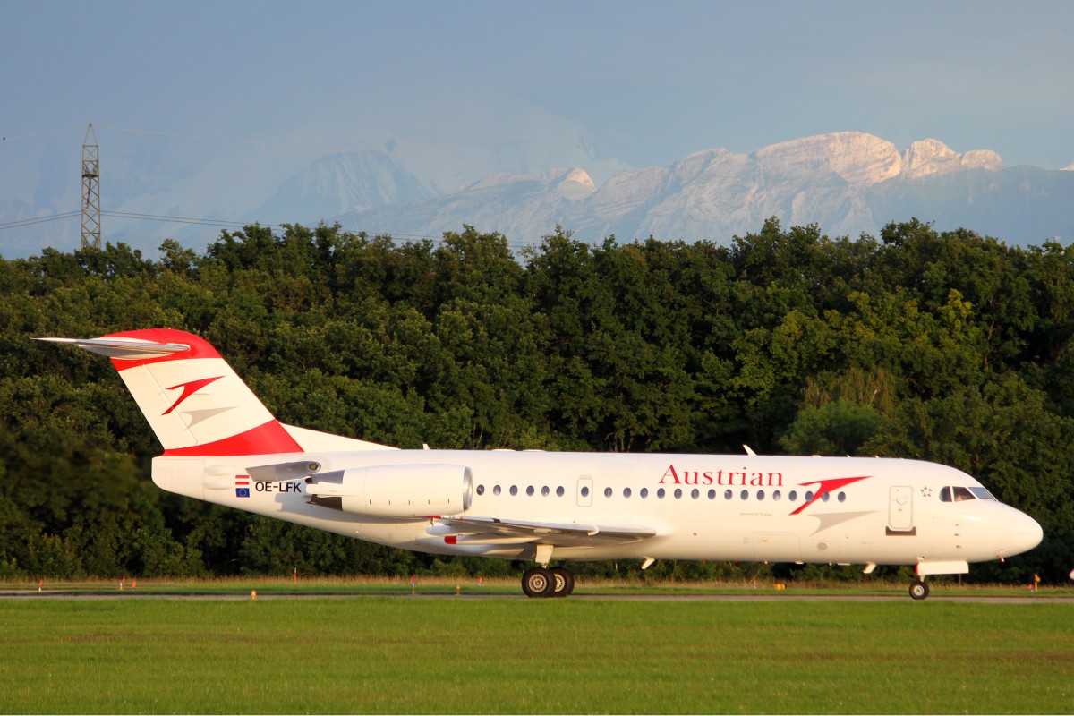 Austrian Airlines, OE-LFK, Fokker 70,  Krems , 8. August 2014, GVA  Genève, Switzerland. Ohne Blaue Bemalungen.