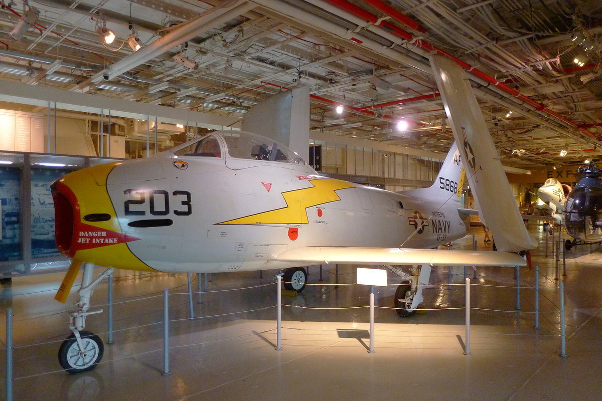 North American FJ-3 Fury, US Navy BuNo 135868, AF 203. Dargestellt in Farben der VF-33 Squadron auf der Intrepid im Jahr 1957. Intrepid Sea, Air & Space Museum, New York-Manhattan. Aufnahmedatum: 26.09.2018.