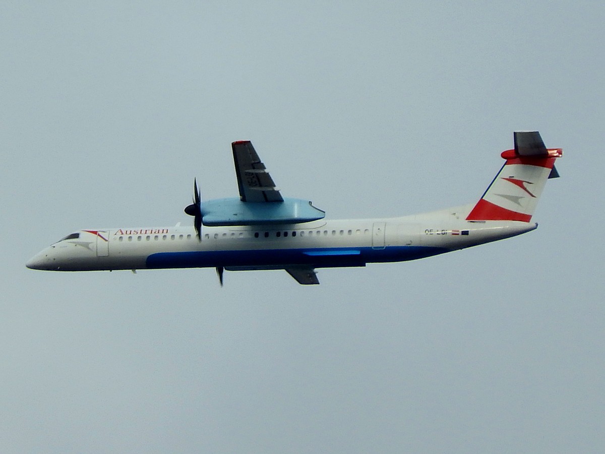 Dash 8 OE-LGI von Austrian, kämpft sich bei starkem Gegenwind dem Zielflughafen Wien-Schwechat entgegen; 151130