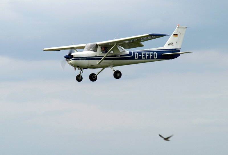 Cessna F-150 Commuter der Franken Flugschule Herzogenaurach. Im Anflug auf Piste 27 begleitet von einem Vogel. 14.08.2008