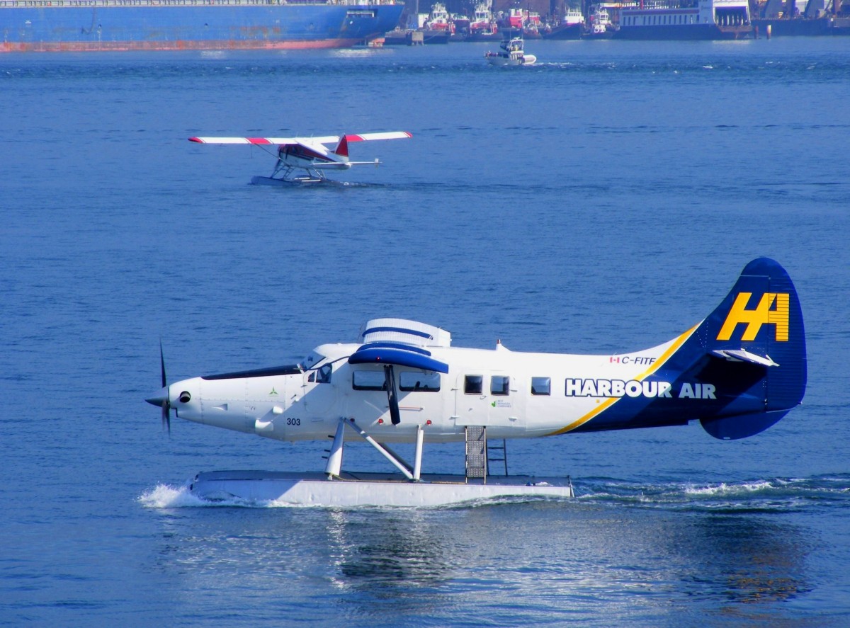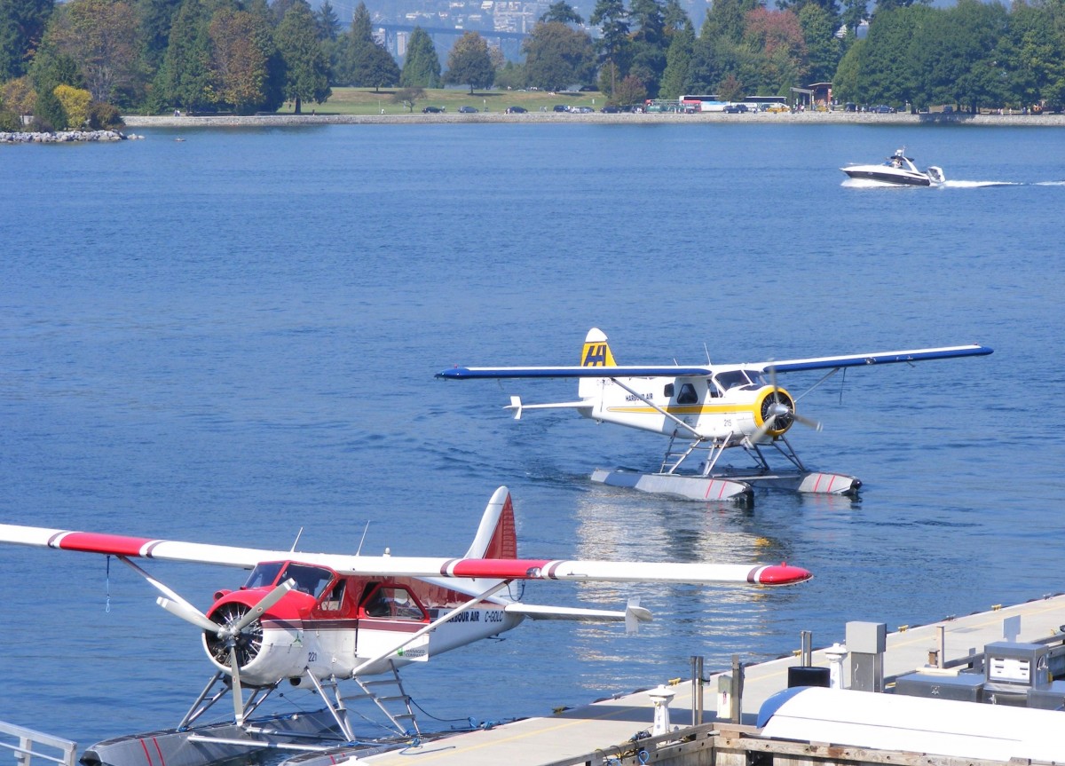 DHC-2 Beaver C-FOCY auf dem Weg zum Start,während hinten links eine Otter davon zieht und eine Twin Otter startet.Vancouver Harbour Airport(CXH) am 13.9.2013